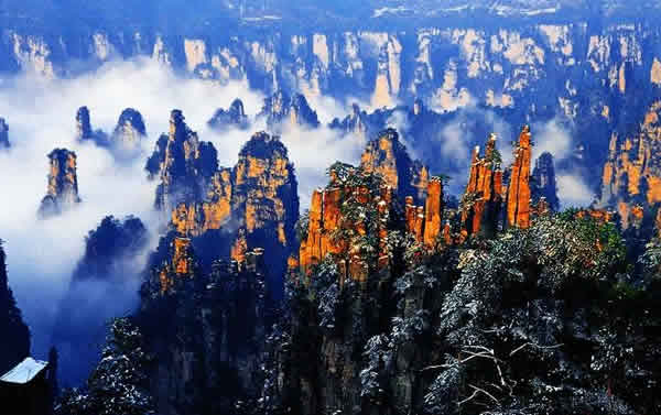 御筆峰 御筆峰被公認為是武陵源砂巖大峰林風光的標志景點,不斷出現在海內外各種媒體和宣傳品上面,堪稱天下一絕。本來,這是大自然鬼斧神工的神來之筆,科學上講是歲月風化、浸蝕、切[1]削的結果,但民間卻把它與向王天子聯(lián)系在一起,說是向王天子殉難后,他的御筆化成石峰,廝守在神堂灣邊;而裝御筆的“簽筒”、“筆架”則留在水繞四門。然而,千古興亡,時代更迭,“古今多少事,都付笑淡中”。只有這支“御筆”還在!在詩人眼中,好用它來寫瀟瀟灑灑的霧,寫多姿多彩的云,寫火一般熱烈的朝霞,寫夢幻般純潔的月光,寫“高處不勝寒”的冰雪世界。當然,也可以寫您熱戀這方山水或者熱戀某位紅顏知己的情詩。