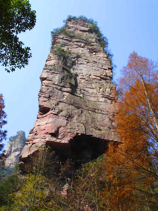 金鞭巖:過“閨門峰”沿溪而下約500米,有一座高約400米,孤標(biāo)直立,雄奇挺拔的奇峰,名金鞭巖。金鞭巖是武陵源著名景點(diǎn),峰體上細(xì)下粗,四棱分明。棱面布滿節(jié)理橫紋,形成鞭節(jié),渾如一根豎插大地的長(zhǎng)鞭。每當(dāng)夕陽晚照,鞭身涂金,熠熠閃光,瑰麗奪目,構(gòu)成一幅奇特壯美的“夕陽金鞭圖”。