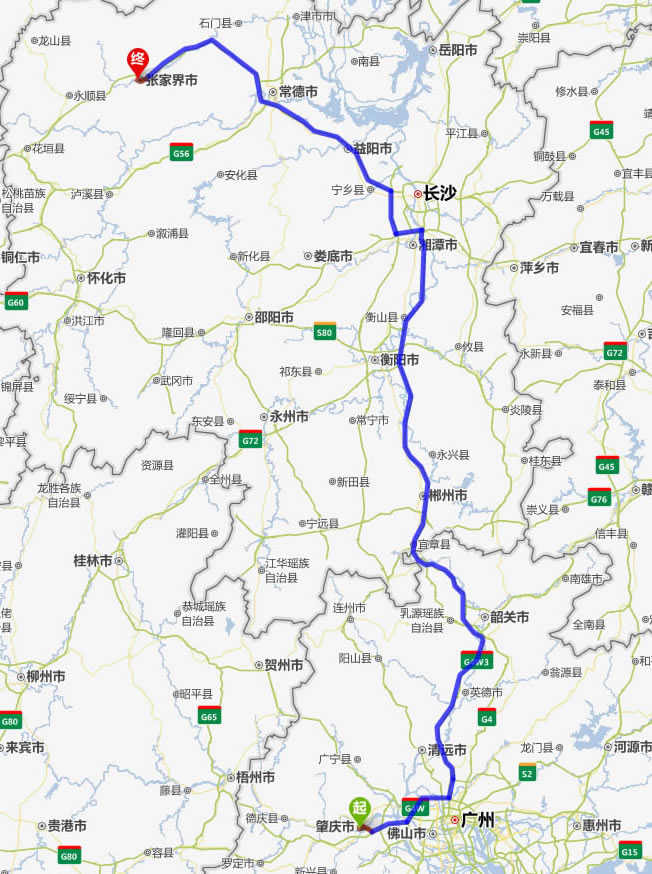 肇慶去張家界自駕車自助游線路圖全程高速):