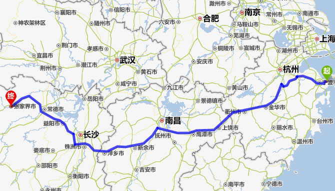 左右,沿途經過北侖——寧波——紹興市——金華市——衢州市——上饒市——鷹潭市——新余市——宜春市——萍鄉(xiāng)市——株洲市——湘潭市——寧鄉(xiāng)縣——益陽市——常德市——慈利縣——張家界。