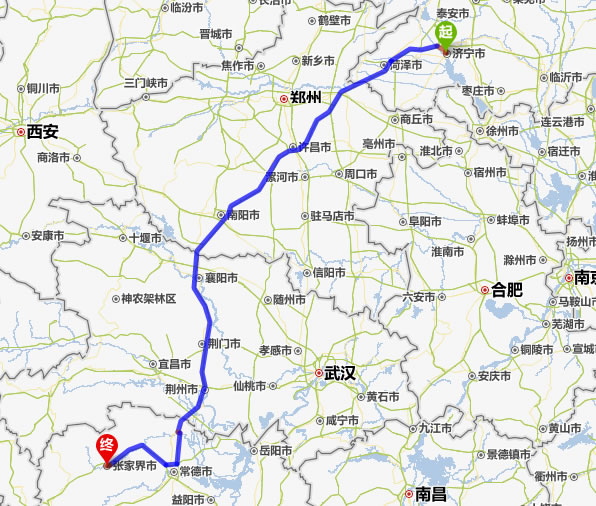 左右,沿途經過濟寧——菏澤——蘭考縣——開封——尉氏縣——許昌市——平頂山——南陽——襄陽——荊門——荊州——常德(也可以走國道經澧縣、石門縣)——慈利——張家界。