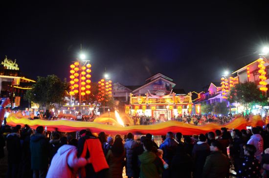 火龍出場(chǎng),街區(qū)狂舞;盤龍點(diǎn)睛,眾人祈福。12月21日,農(nóng)歷冬至,當(dāng)天夜晚在旅游勝地張家界武陵源區(qū)溪布老街?jǐn)[手堂廣場(chǎng)啟動(dòng)的 “武陵腔調(diào):趕火趕戲趕大年”活動(dòng)儀式上,一條全身似火的長龍?jiān)诮倜良覂号奈鑴?dòng)下 “閃亮”登場(chǎng),格外耀眼。據(jù)了解,這條長龍身有香味,全長108米,是目前世界最長的香火龍。