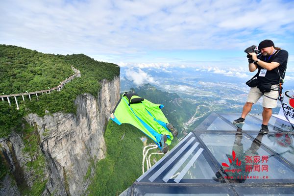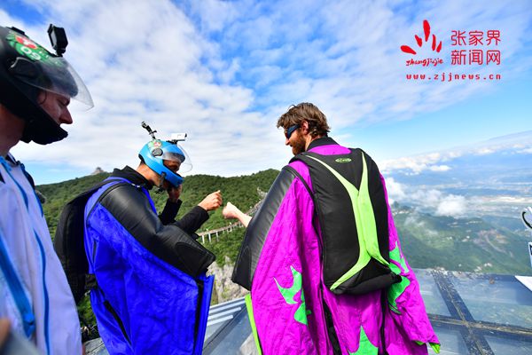 2017世界翼裝飛行世錦賽將于9月8日-10日在張家界天門山舉辦。開賽在即,9月7日上午,來自全球11個(gè)國(guó)家的16名翼裝飛行員從海撥1458米的張家界天門山玉壺峰頂一躍而下,在奇峰險(xiǎn)壑間進(jìn)行競(jìng)速訓(xùn)練。